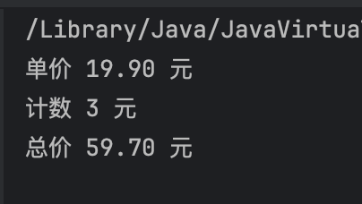 public static void main(String[] args) {double price = 19.9;int count = 3;double total = price * count;System.out.printf("单价 %.2f 元\n", price);System.out.printf("计数 %d 元\n", count);System.out.printf("总价 %.2f 元\n", total);}