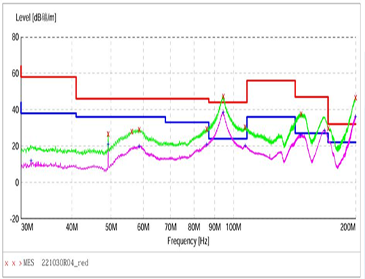 在30MHz-1GHz频率范围内,多个频点超出标准限值,特别是在50-200MHz频段,超标最为严重,最大超出限值约15dB。
