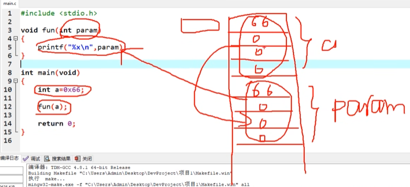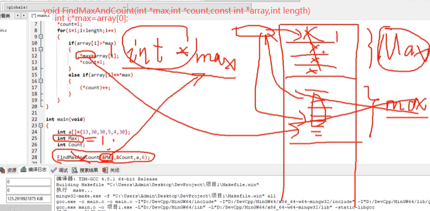 上图解析:我们看一下Max是怎么样实现返回值的,首先定义这个Max,这主函数的Max是int类型的,因此会被分配4个字节的空间,地址是如何分配的,然后Max没有输出值,所以里面的变量是随机的xx,然后我们调用一下这个FindMaxAndCount这个函数,把Max的地址和Count的地址给复制进去,这个形参定义在子函数上面是个指针类型的int *max,这个是64位系统的,因此是8个字节的max,因此变量需要加个取地址符才能做到同级赋值,因此是&Max的地址赋值给到了这个小写max指针变量,所以这个地址将会被复制到指针变量里面去,这个就表示它的地址,然后当我们需要应用这个变量的时候,比如说我给*max赋值,因为max是指针变量,所以需要*max取出内容,*max是多少呢,这里我给子函数的*max赋值就相当于给主函数的Max赋值,当我们这个子函数返回之后,它返回这个局部变量,这个指针被销毁,主函数的Max等于多少呢?就等于1,因为你将子函数的*max给了一个1;就是说你再子函数获取到的值是多少,那你主函数的值就是多少,而且你使用了两个指针变量进行改值,那就可以返回两个函数值给到主函数使用,多个指针变量就可以返回多少个返回值。特点就是你再子函数中更改这个传递的指针变量,就是返回值,本质上应用的是同一个变量。
