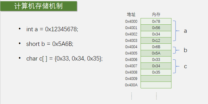 右边的图就是我们实际的一个内存的一个模式图,在我们计算机的内存里,我们通常把内存分配成一个线性的空间,然后在每个区域都是以字节为单位的,那比如说图上的0x78这一个字节,数据以字节为单位这样线性的分配下去,然后每个字节都会对应一个地址,如果你字节不对应地址,那就访问不到你了,那这个内存就没有意义了,所以为了访问这个数据,每个字节都会有它独一无二的地址,这个地址是从0一直往下分配的,也有可能不是从0;总之这是一个线性的分配区域,给它编码一个地址,比如说右边这个内存,假设它是从0x4000开始分配的,它就会线性的依次往下分配,然后分配一个足够大的内存,来给我们这个操作。