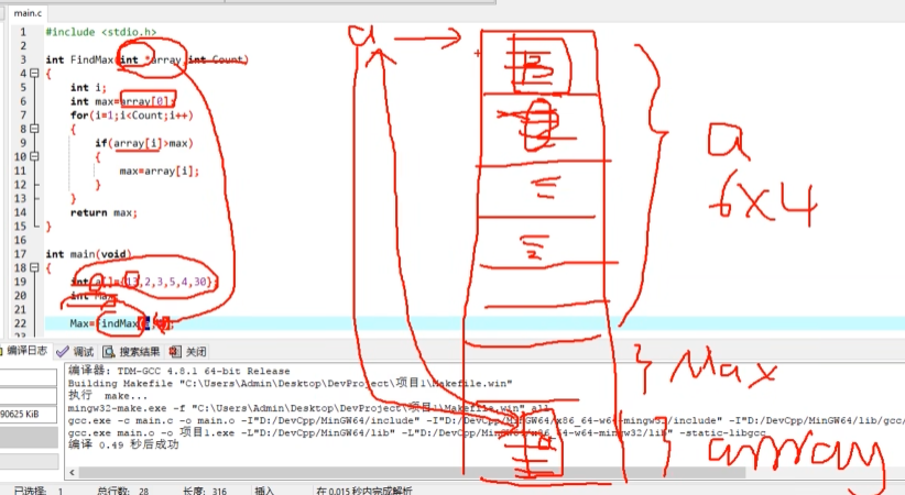 这是一个很常用的一个应用场景。例如下面的这个寻找最大数组里的值Max是多少,只是新创建了一个8字节(64位系统的int*是8个字节)的指针内存开销,然后还是直接访问的主函数定义的数组(指针),所以子函数和主函数是共用一个数组的,主函数访问的是它,子函数通过指针访问的间接访问的也是它,所以它俩共用一个数据,这就避免了数据的复制,子函数结束了之后,它作为一个局部变量将被销毁,也就是这个指针变量被销毁了,然后返回主函数,主函数继续用它的这个数组。