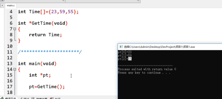 注意事项:你千万别把一个局部变量的指针给返回了,比如上面的Time数组是局部变量,而不是全局变量,然后你把它的地址给返回过去了,就会出问题;因为局部变量在函数结束之后,局部变量将被销毁,即使它还是原来大家内存,但是它被销毁了,你这样再把它的地址给返回出去,主函数虽然能够应用这个内容,但其实这个内容被销毁了,这个指针指的是一个无效的位置,这样数据就会出错了。而这个模块类的全局变量是不会被销毁的,所以这样返回才是可以的。