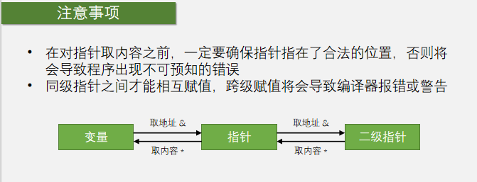 第二条是同级指针之间才能相互赋值,跨级赋值将会导致编译器报错或警告,但有时候也需要我们跨级赋值,所以这里有时候是报错,有时候是警告,警告就是告诉你注意一下你是不是真的要非法跨级赋值,正常情况下,我们都是同级指针之间相互赋值;上面的图就是说我们可以将变量当做零级指针,就指针最终取出内容就是变量;然后普通指针就是一级指针,指针再取地址就是二级指针,然后你对它相互赋值的话,一定要确保它俩是同一级的;比如你想把一个变量赋值给一个指针,那你要对这个变量进行取地址,因为变量取地址它就是指针,然后变量取地址才能给指针赋值,保证同级;如果你指针赋值给有变量的话,你最好加一个指针取内容,加* 号这样才能赋值,同理二级指针也是一样的。