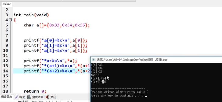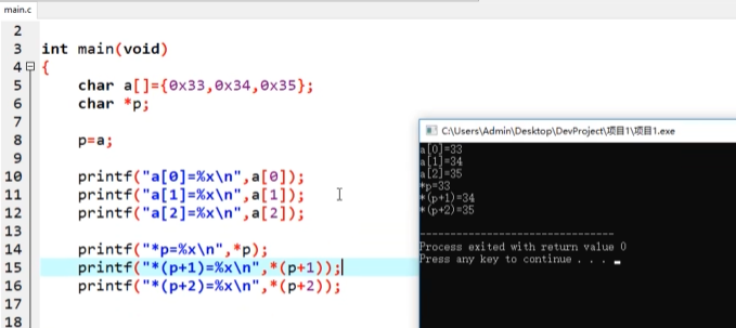 同样,引用也是可以用指针进行互换的,比如说利用数组下标引用数组数据也等效于指针取内容,那数组取下标是不是就是指针取内容,c[0]就等效于*c;c[1]就等效于*(c+1);c[2]就等效于*(c+2);