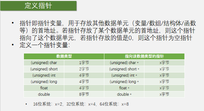 注意指针的内存字节大小是随系统的变化而变化的,也就是说指针变量的位宽和你的系统这个位宽是一样的,为什么是这样的呢?我们刚才也说了指针是用来存放某个数据单元的首地址,指针变量只要够存,能存得下,我们就定义这些。