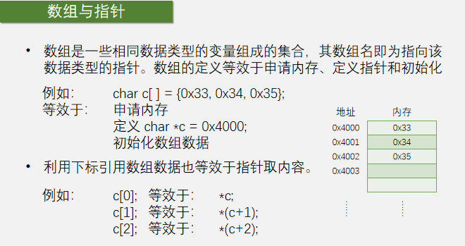 其实数组也是指针的一种表达形式,数组本身就是指针,其数组名即为指向该数据类型的指针,数组的定义等效于申请内存、定义指针和初始化。