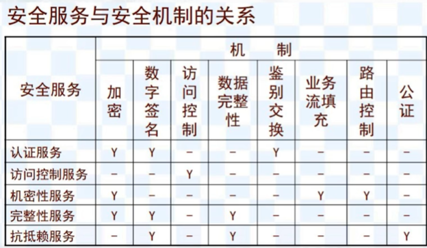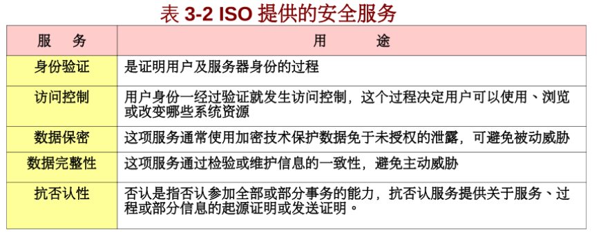 - 安全服务:包括五大类:认证服务,访问控制服务,数据保密性服务,数据完整性服务,抗否认服务,用于保障网络通信的安全性和可信性