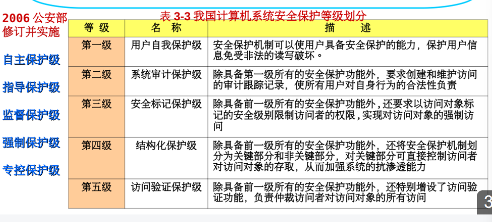 - 第三级:安全标记保护级---要求以访问对象标记的安全级别限制访问者的权限,实现对访问对象的强制访问