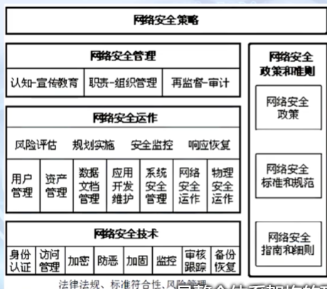 网络安全防御体系基于法律,准则,策略,机制和技术,并以安全管理和运行防御体系贯穿始终