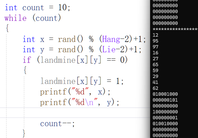 {int count = 10;while (count){int x = rand() % (Hang-2)+1;int y = rand() % (Lie-2)+1;if (landmine[x][y] == 0){landmine[x][y] = 1;printf("%d", x);printf("%d\n", y);count--;}}