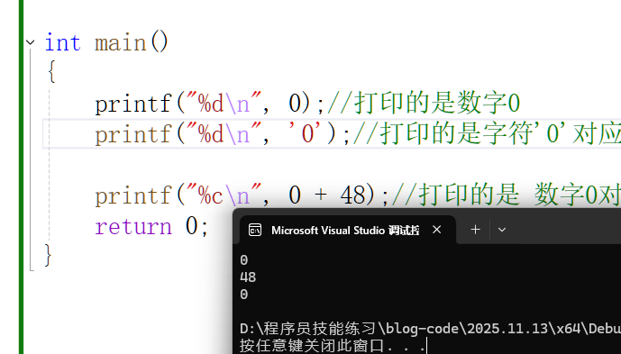 {printf("%d\n", 0);//打印的是数字0printf("%d\n", '0');//打印的是字符'0'对应的ASCII值printf("%c\n", 0 + 48);//打印的是 数字0对应的ASCII值加上48,获得的新ASCII值对应的字符return 0;