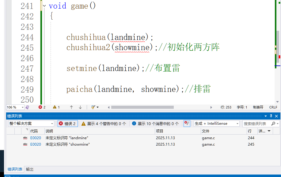 你在 game 函数里想让这两个 “箱子” 干活(调用函数操作它们),但编译器压根没见过这两个 “箱子” 长啥样,所以它就懵了 ——“你说的 landmine 和 showmine 是啥?我不认识啊!”