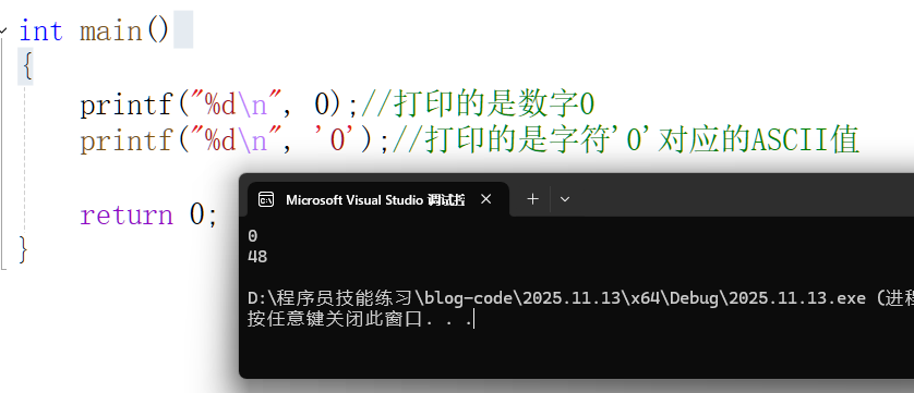 {printf("%d\n", 0);//打印的是数字0printf("%d\n", '0');//打印的是字符'0'对应的ASCII值return 0;