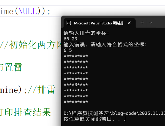 chonglai:scanf("%d%d", &a, &b);if (a >= 1 && a <= 9 && b >= 1 && b <= 9){if (landmine[a][b] == 1){printf("你踩到雷了,炸死,游戏结束");return;}else{// 新增:判断坐标是否已排查if (showmine[a][b] != '*'){printf("该坐标已排查,请重新输入:");goto chonglai;}int c = 0; // 存储周围雷数// 后续雷数计算逻辑不变...int i;for (i = a - 1; i <= a + 1; i++){int j;for (j = a - 1; j <= a + 1; j++){c += landmine[i][j];}}showmine[a][b] = c + 48;}}else{printf("输入错误,请输入符合格式的坐标:");goto chonglai;}}