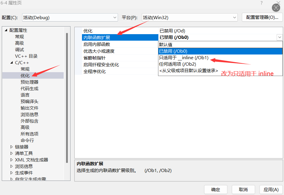 vs编译器 debug版本下面默认是不展开inline的,这样方便调试,debug版本想展开需要设置⼀下以下两个地方。