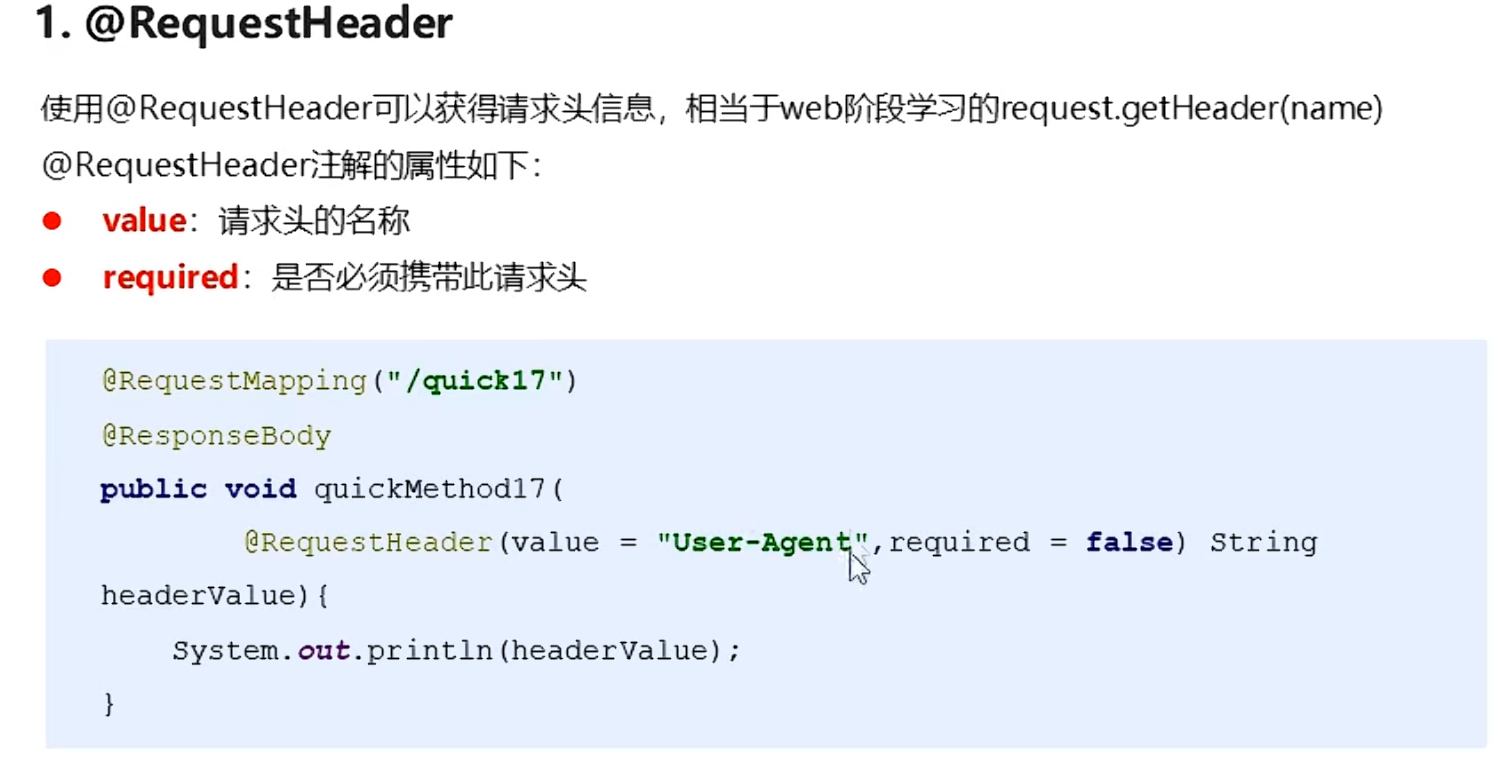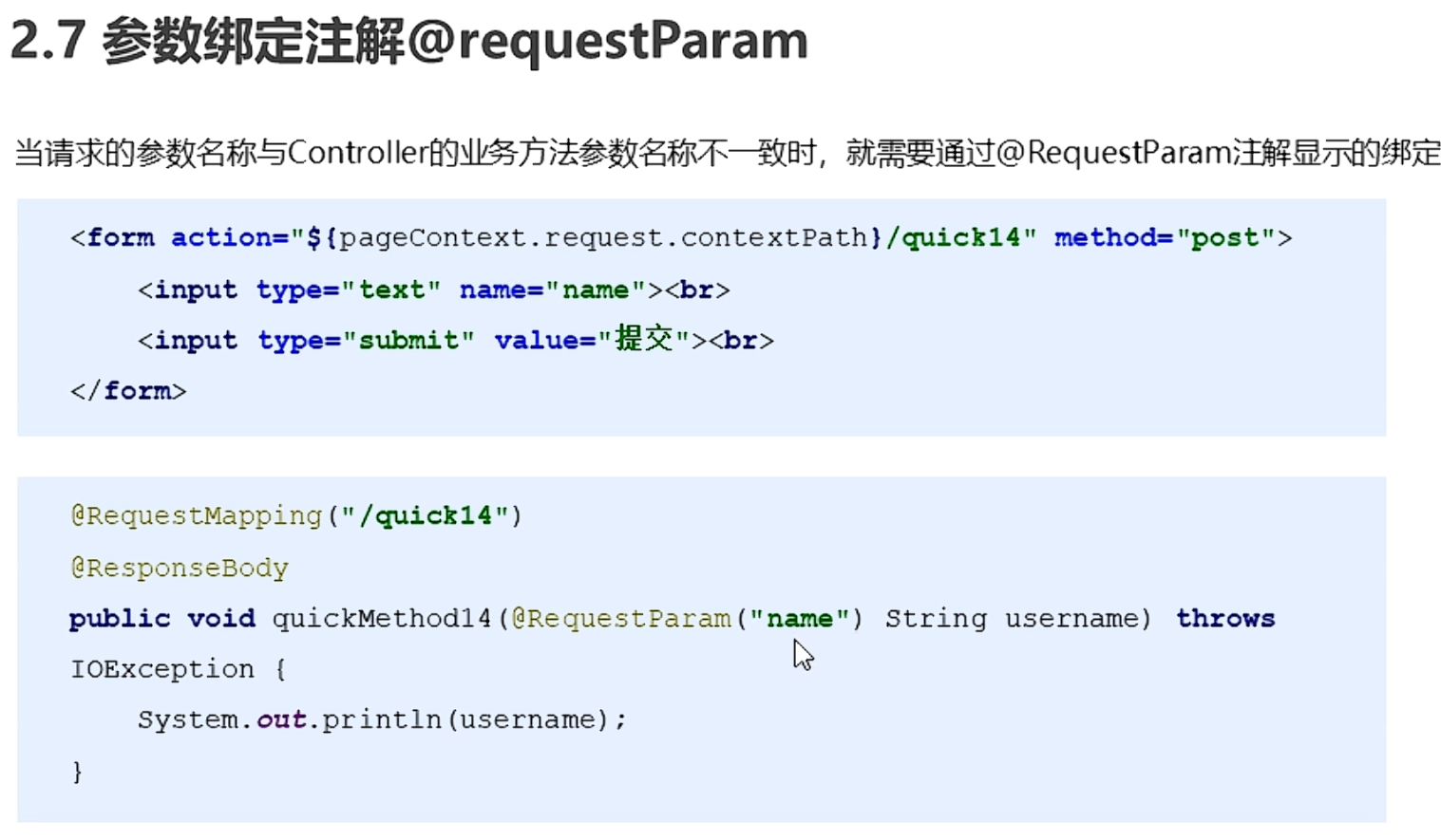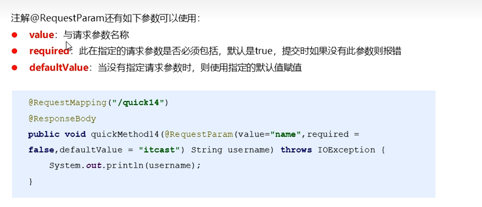@RequestMapping(value = "/quick16")@ResponseBodypublic void save16(@RequestParam(value = "name", required = false, defaultValue = "itcast") String username) throws IOException {System.out.println(username);}@RequestParam 把查询参数 name 绑定到方法形参 username :