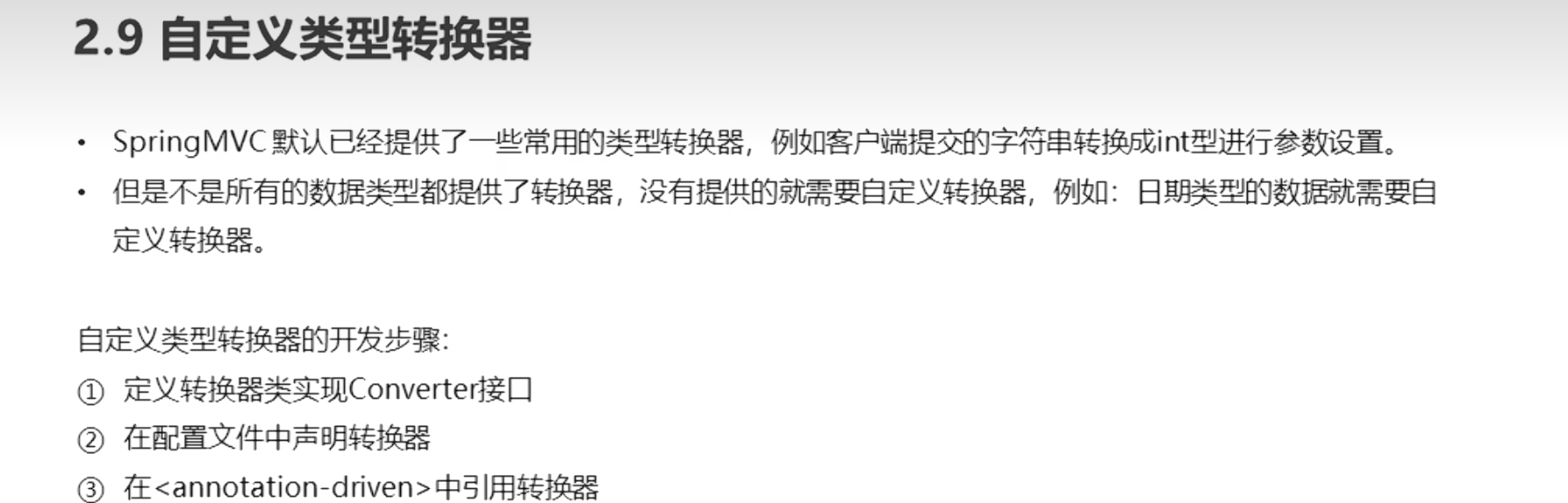 public class DateConverter implements Converter<String, Date> {public Date convert(String dateStr) {// 将日期字符串转换成日期对象返回,也就是转成2018-6-18这种格式SimpleDateFormat format = new SimpleDateFormat("yyyy-MM-dd");Date date = null;try {date = format.parse(dateStr);} catch (ParseException e) {e.printStackTrace();}return date;}}2.在springmvc中声明告诉spring
