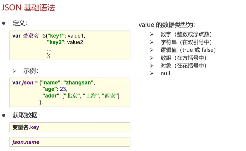 JSON Javascript对象表示法 由于其语法简单,层次结构鲜明,多用于作为数据载体在网络中进行数据传输