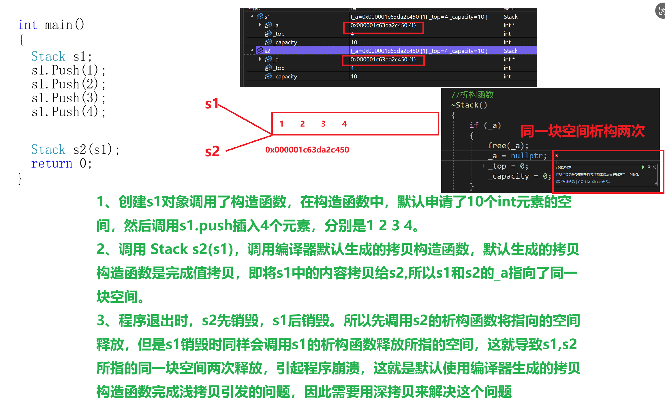 3、程序退出时,s2先销毁,s1后销毁。所以先调用s2的析构函数将指向的空间释放,但是s1销毁时同样会调用s1的析构函数释放所指的空间,这就导致s1,s2所指的同一块空间两次释放,引起程序崩溃,这就是默认使用编译器生成的拷贝构造函数完成浅拷贝引发的问题,因此需要用深拷贝来解决这个问题