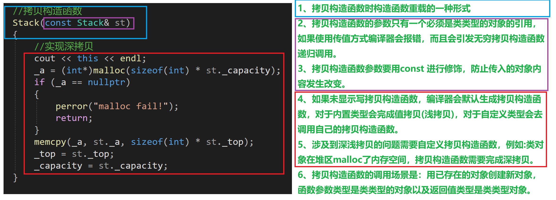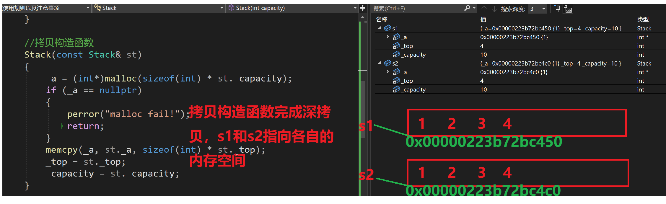 public://全缺省构造函数Stack(int capacity = 10){cout << this << endl;_a = (int*)malloc(sizeof(int) * capacity);if (_a == nullptr){perror("malloc fail!");return;}_top = 0;_capacity = capacity;}//拷贝构造函数Stack(const Stack& st){//实现深拷贝cout << this << endl;_a = (int*)malloc(sizeof(int) * st._capacity);if (_a == nullptr){perror("malloc fail!");return;}memcpy(_a, st._a, sizeof(int) * st._top);_top = st._top;_capacity = st._capacity;}//插入数据void Push(int x){_a[_top] = x;_top++;}//析构函数~Stack(){if (_a){free(_a);_a = nullptr;_top = 0;_capacity = 0;}}