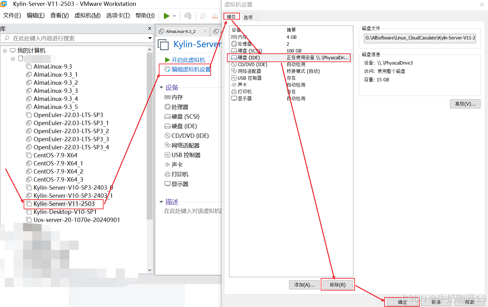 注意:若是VMware虚拟机则需要点击【系统重启】按钮后关闭该系统;然后选中该虚拟机-->点击【编辑虚拟机设置】-->【硬件】-->选中【硬盘IDE】-->【移除】-->【确定】后再重新启动该银河麒麟高级服务器操作系统对应的虚拟机即可。详细操作如下图所示: