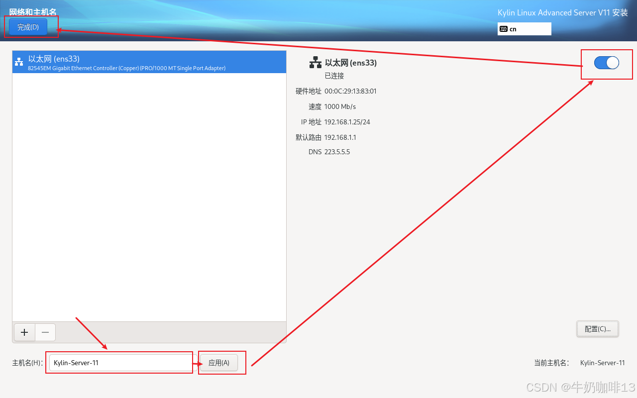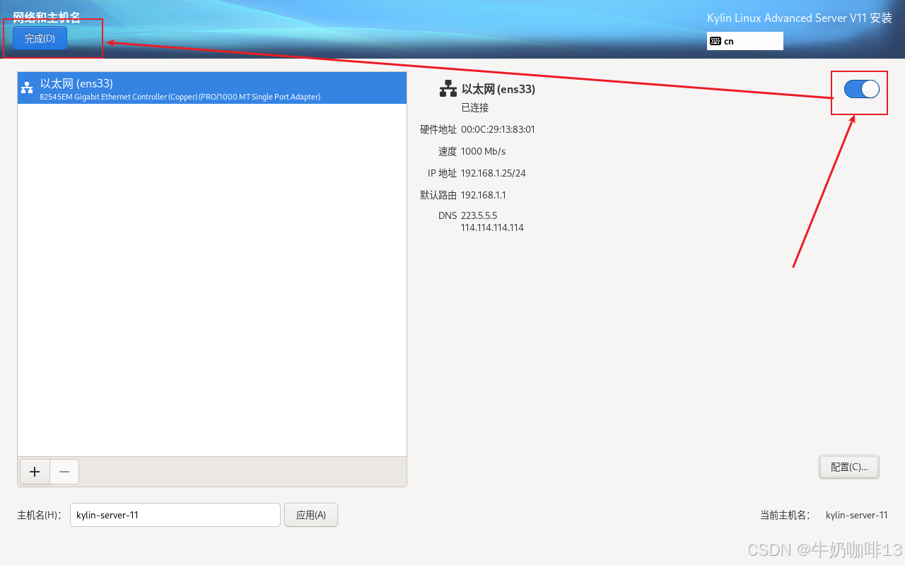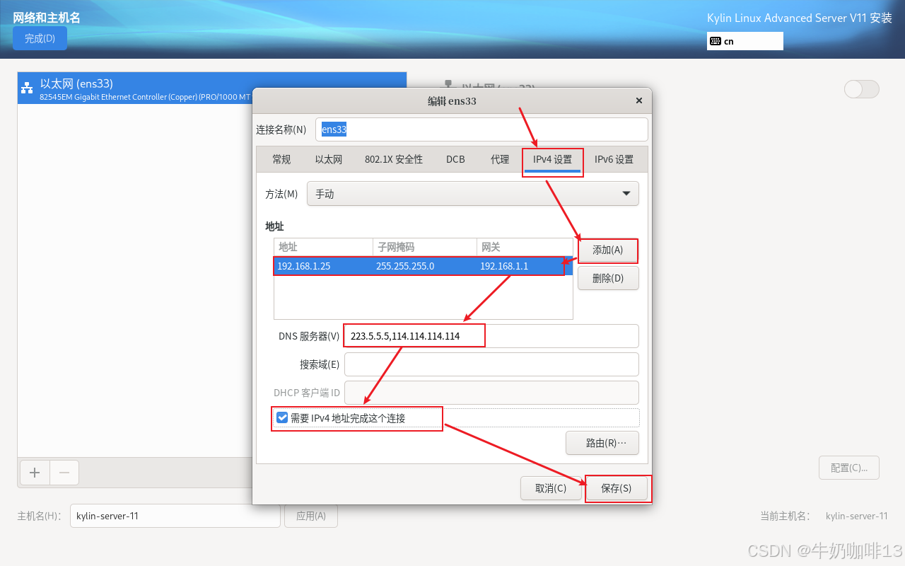点击【网络和主机名】进入配置界面:首先配置主机名称(输入主机名称(如:kylin-server-11)点击应用即可);然后手动设置改服务器的IP地址(【选中网卡(如:ens33)】-->【配置】-->【选择【IPV4设置】-->【添加】(输入规划好给改服务器的IP地址内容如IP地址是:192.168.1.25、子网掩码是:255.255.255.0 网关是:192.168.1.1)】)-->【DNS内容是(255.5.5.5,114.114.114.114)】-->【勾选【需要IPV4地址完成这个链接】】-->【保存】-->启用该网卡-->【完成】详细操作如下图所示: