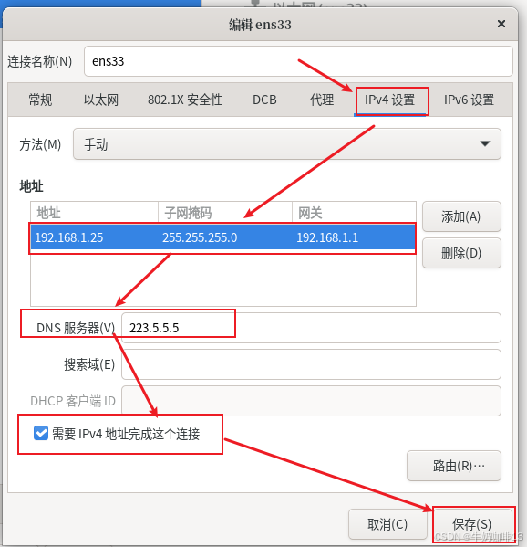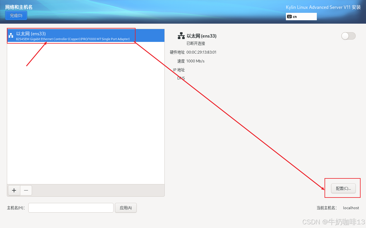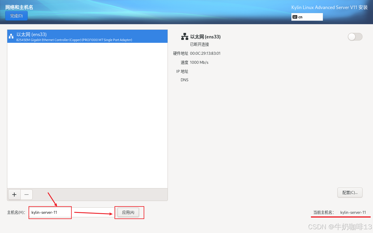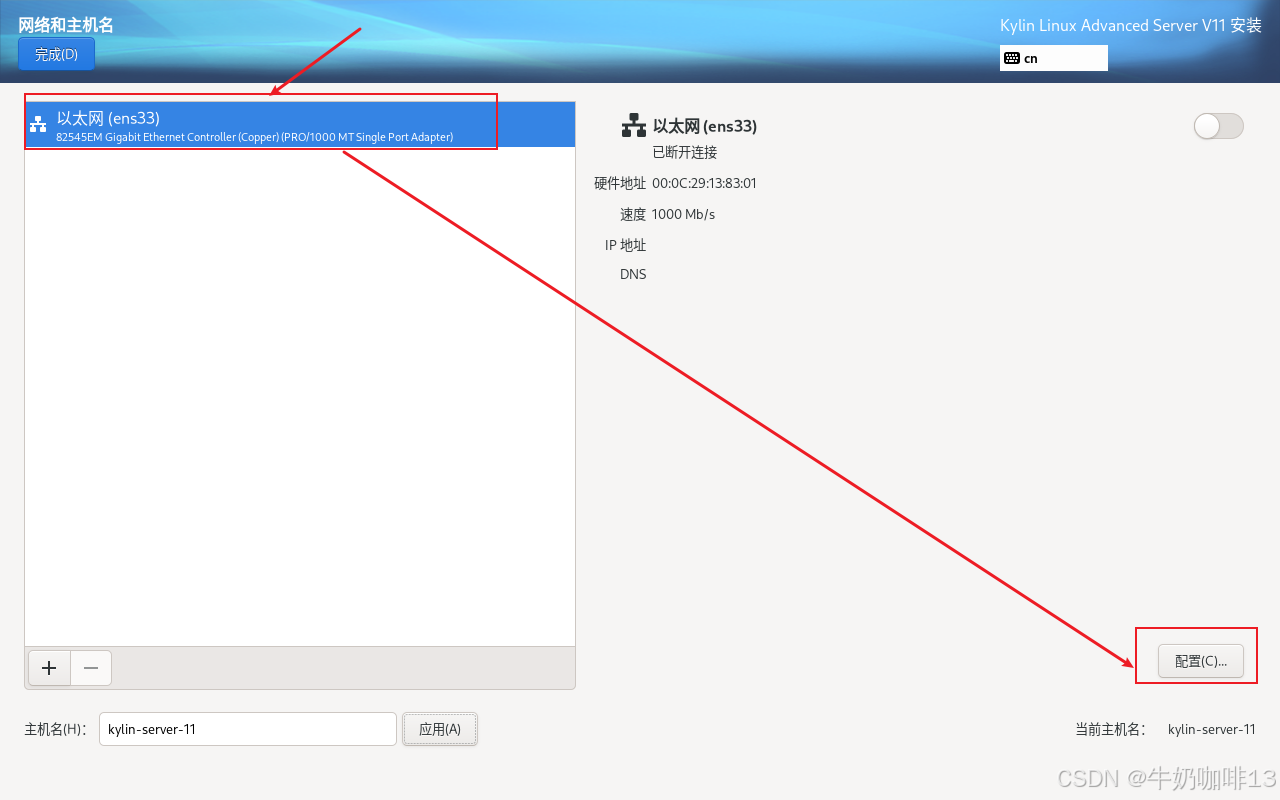 点击【网络和主机名】进入配置界面:首先配置主机名称(输入主机名称(如:kylin-server-11)点击应用即可);然后手动设置改服务器的IP地址(【选中网卡(如:ens33)】-->【配置】-->【选择【IPV4设置】-->【添加】(输入规划好给改服务器的IP地址内容如IP地址是:192.168.1.25、子网掩码是:255.255.255.0 网关是:192.168.1.1)】)-->【DNS内容是(255.5.5.5,114.114.114.114)】-->【勾选【需要IPV4地址完成这个链接】】-->【保存】-->启用该网卡-->【完成】详细操作如下图所示: