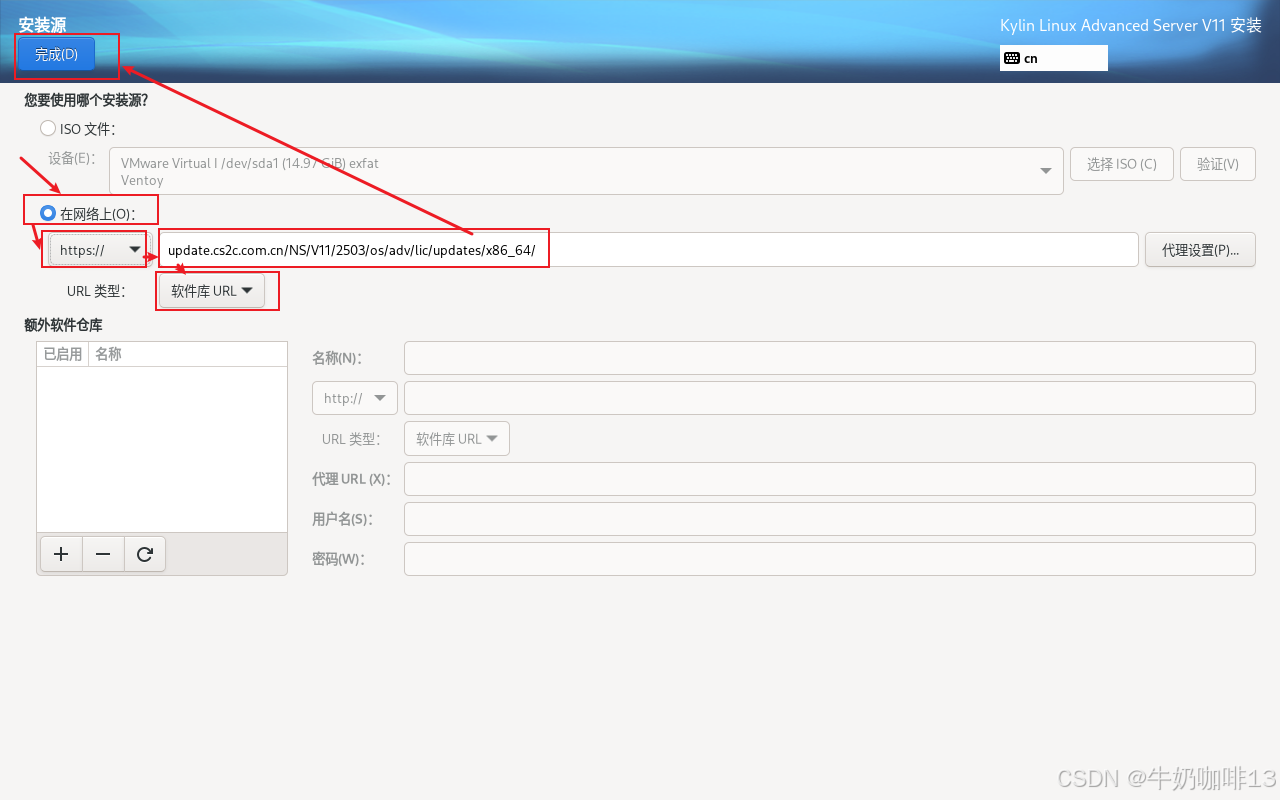 ②点击【安装源】-->【】输入正确的外网源地址(如我这里使用的银河麒麟高级服务器操作系统V11-202503(x86_64)的外网源地址是【https://update.cs2c.com.cn/NS/V11/2503/os/adv/lic/updates/x86_64/】)。