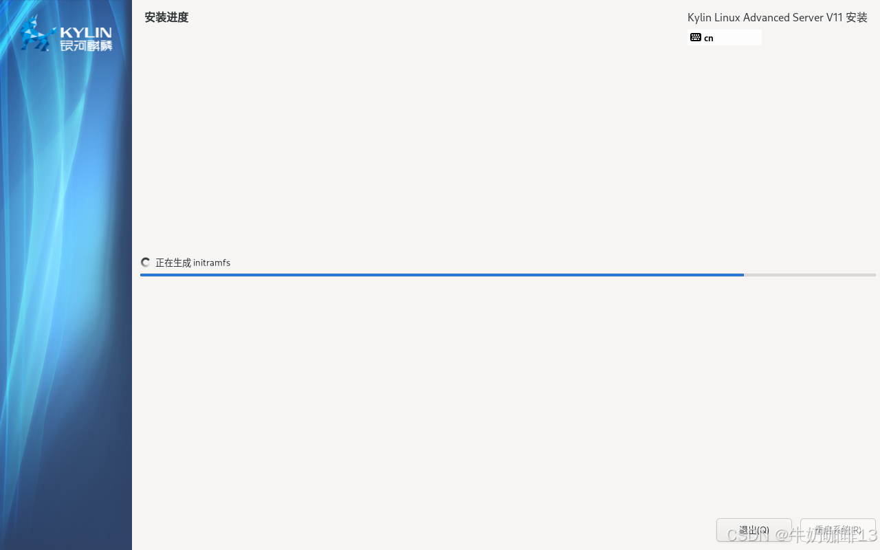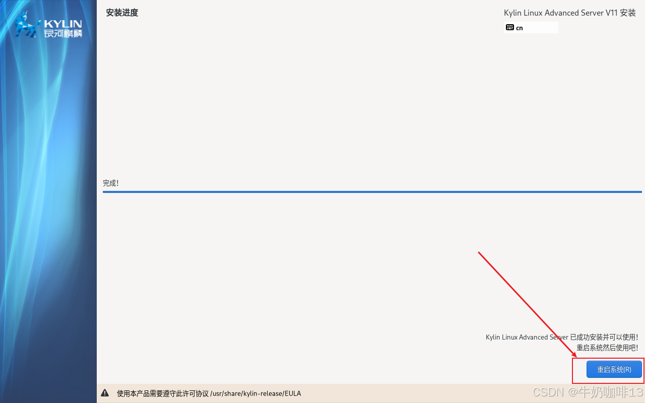 这里安装银河麒麟高级服务器操作系统的时间取决于服务器的硬盘与U盘启动器中传输速度最慢的一方,需要耐心等待几分钟到十分钟左右(视具体情况而定);到最后点击右下角的【重启系统】按钮等待系统重启即可(注意:点击重启系统后可以将U盘启动器移除),详细操作如下图所示: