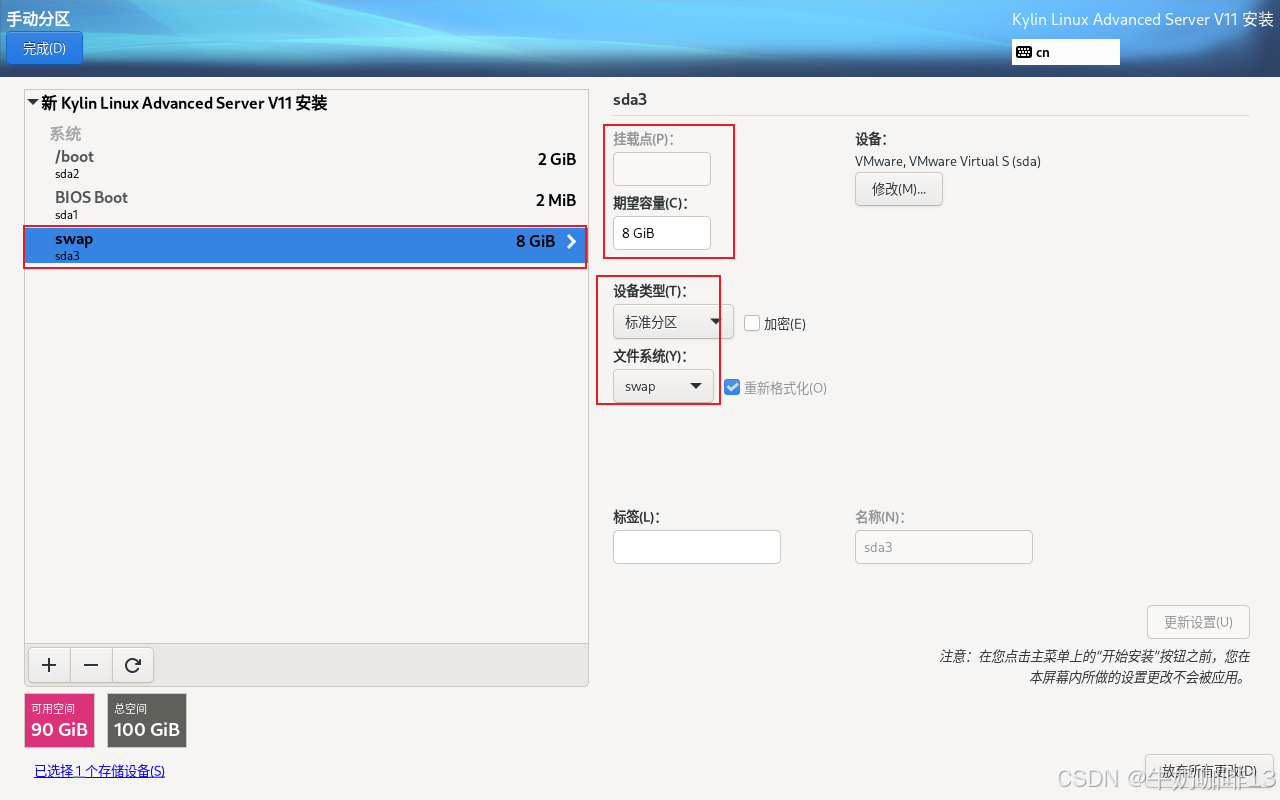 | swap | 交换分区 弥补物理内存不足情况,一般建议【物理内存大于16G配置4G】【物理内存小于16G配置8G】 | |