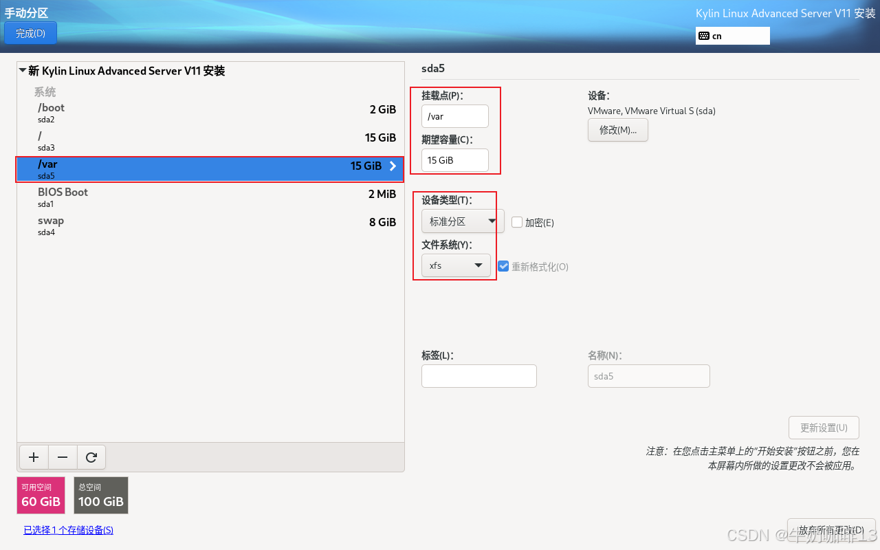 | /var | 存放系统日志内容 空间根据物理硬盘大小配置,一般配置为物理硬盘容量的10%-20%【如:物理硬盘空间是100G那么这里就可以配置10g-20g】 | |