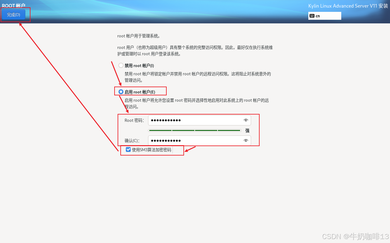 点击界面上的【Root账户】-->【启用root账户(然后输入root账号的密码,注意:这个密码有要求需要有大小写字母数字特殊符号混合且不低于8位)】-->【勾选使用SM3算法加密密码】-->【完成】详细操作如下图所示: