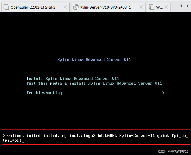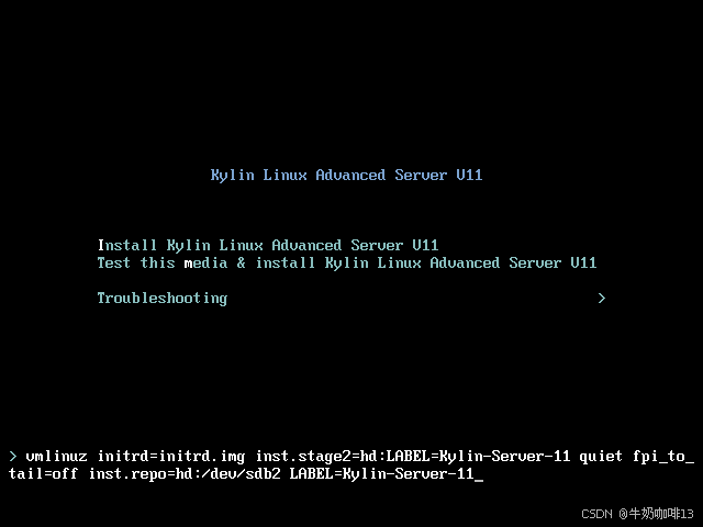 若机器是在内网(或不想重新下载一遍包)则可以通过强制指定安装源位置来跳过此 Bug(即:在启动到安装界面 或 Grub2 页面时,按 Tab 或 e 键进入编辑状态后在尾部添加【inst.repo=hd:/dev/sdb6 LABEL=XXX,其中XXX与原有参数inst.stage2=hd:LABEL=后面的值一致,如我这里就是【Kylin-Server-11】(完整内容为:inst.repo=hd:/dev/sdb6 LABEL=Kylin-Server-11)】)编辑完成后按下Enter键进入系统安装界面,但是此时进入系统安装界面还是报错“设置基础软件仓库时报错”,这是由于默认将【/run/install/repo】挂载为rw,需要切换到命令行模式重新挂载为ro,详细操作如下: