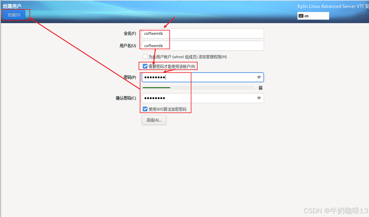 点击界面上的【创建用户】(不是必填内容)-->【输入需要创建的用户名称(如:coffeemilk)和密码、勾选【需要密码才能使用该账户】-->【输入用户密码】-->【勾选使用SM3算法加密密码】】-->【完成】详细操作如下图所示: