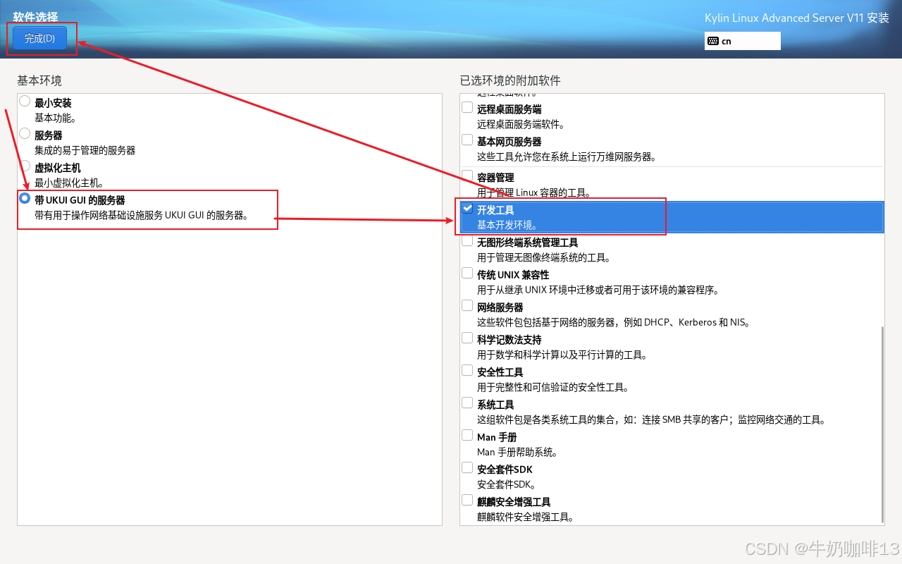 软件选择-->【带UKUI GUI的服务器】-->【开发工具(子所以选择这个是为了最大限度的保证服务器安全,因此只需要最基础的开发环境内容,因为多安装一些无关的软件内容就会多一分安全威胁)】-->【确定】详细操作如下图所示: