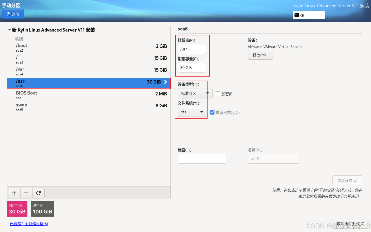 | /usr | 存放安装应用的程序内容 空间根据物理硬盘大小配置,一般配置为物理硬盘容量的20%-30%【如:物理硬盘空间是100G那么这里就可以配置20g-30g】 | |