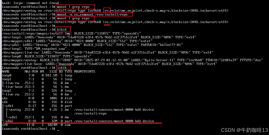 ②执行【mount | grep repo】查看U盘挂载情况是否为ro模式(若不是则执行【mount -o ro,remount /run/install/repo】重新挂载为ro);