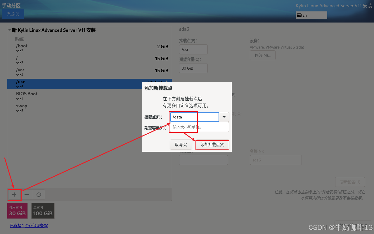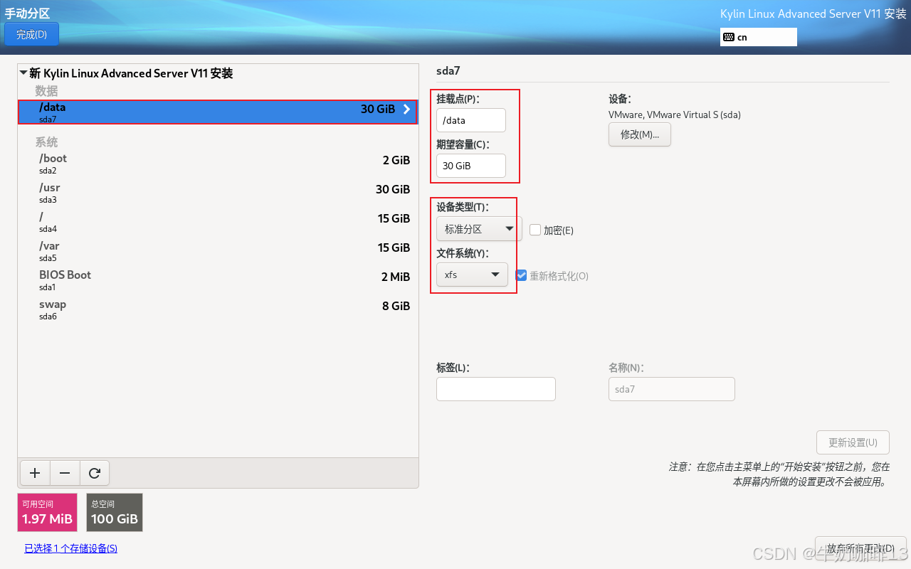| 数据分区 | /data | 用于存放应用程序等内容的数据文件;直接使用剩余的空间(不用填写任何空间就是使用剩余的所有空间) |