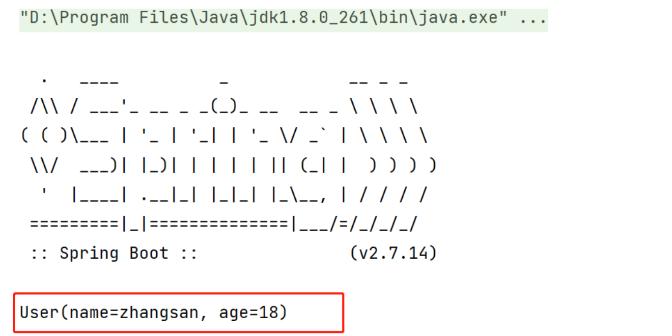 public class BeanConfig {@Beanpublic User user(){User user = new User();user.setName("zhangsan");user.setAge(18);return user;}