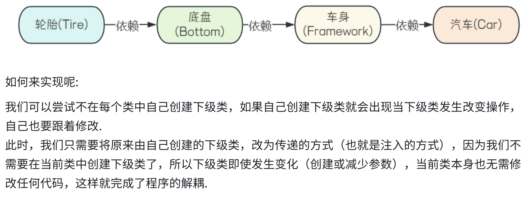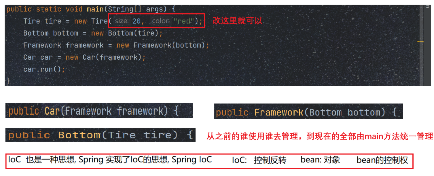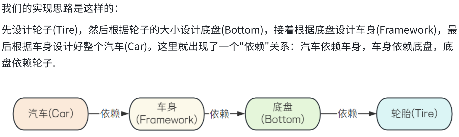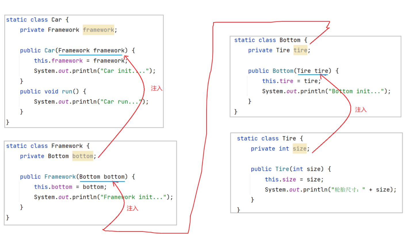 package com.example.springiocdemo.v2;public class Main {public static void main(String[] args) {Tire tire = new Tire(20, "red");Bottom bottom = new Bottom(tire);Framework framework = new Framework(bottom);Car car = new Car(framework);car.run();}static class Car {private Framework framework;public Car(Framework framework) {this.framework = framework;System.out.println("Car init....");}public void run() {System.out.println("Car run...");}}static class Framework {private Bottom bottom;public Framework(Bottom bottom) {this.bottom = bottom;System.out.println("Framework init...");}}static class Bottom {private Tire tire;public Bottom(Tire tire) {this.tire = tire;System.out.println("Bottom init...");}}static class Tire {private int size;private String color;public Tire(int size, String color) {this.size = size;System.out.println("轮胎尺⼨:" + size + ",轮胎颜色:" + color);}}}