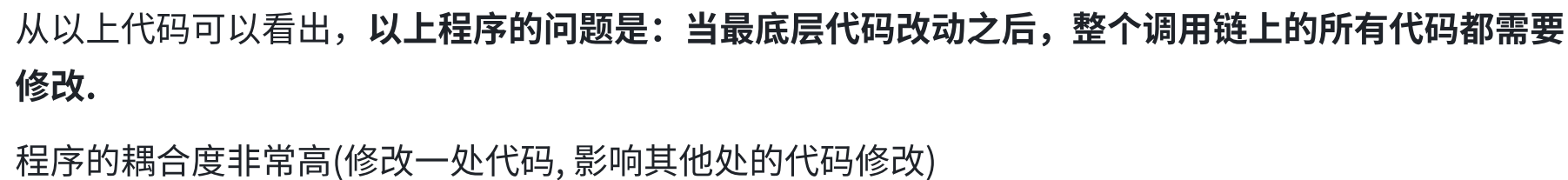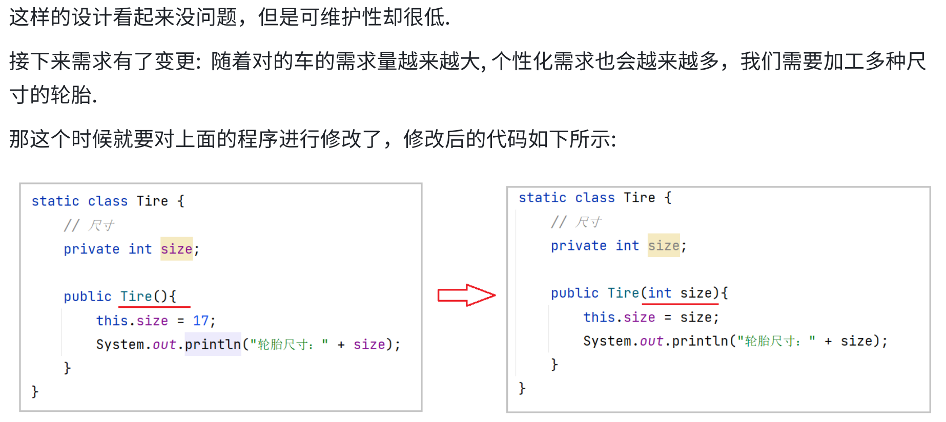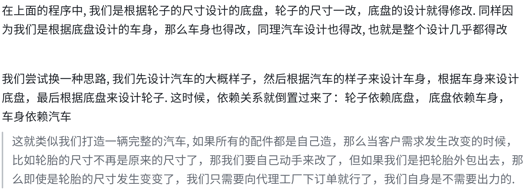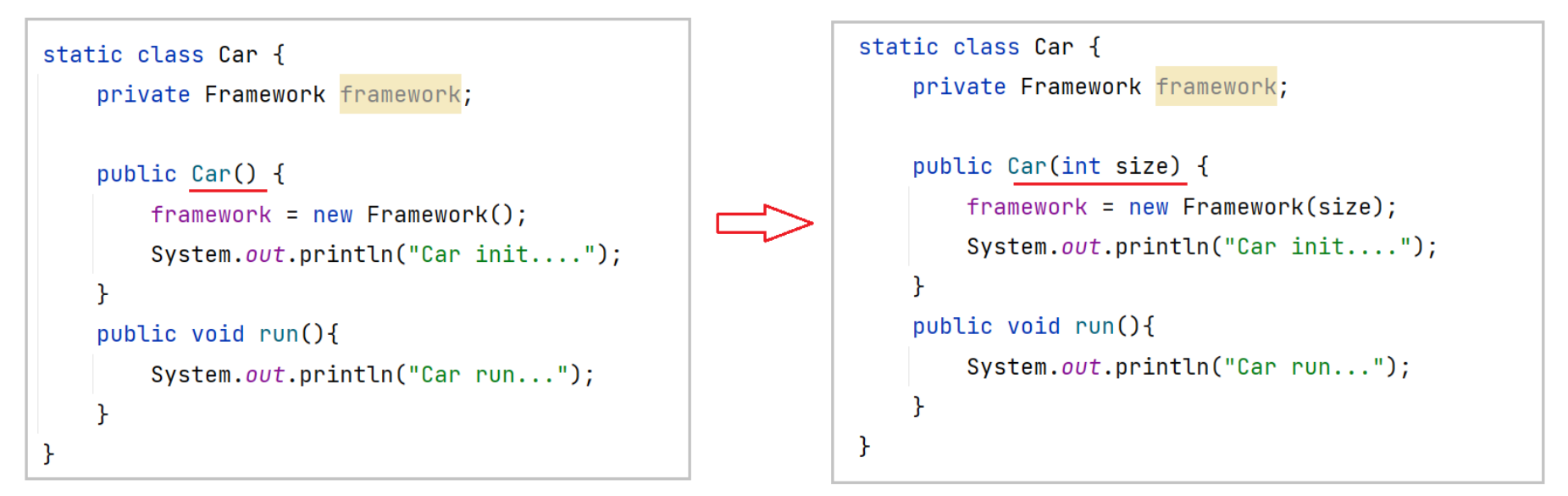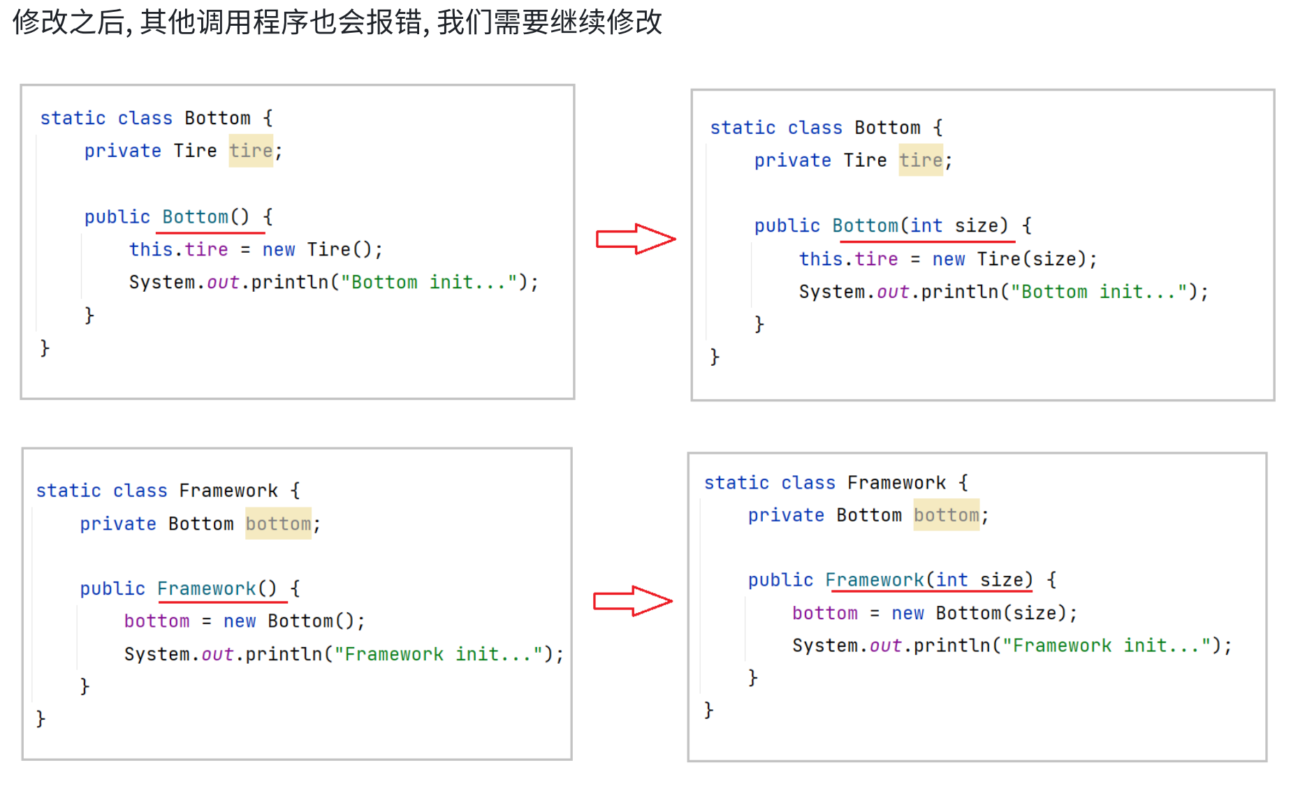 package com.example.springiocdemo.v2;public class Main {public static void main(String[] args) {Tire tire = new Tire(20, "red");Bottom bottom = new Bottom(tire);Framework framework = new Framework(bottom);Car car = new Car(framework);car.run();}static class Car {private Framework framework;public Car(Framework framework) {this.framework = framework;System.out.println("Car init....");}public void run() {System.out.println("Car run...");}}static class Framework {private Bottom bottom;public Framework(Bottom bottom) {this.bottom = bottom;System.out.println("Framework init...");}}static class Bottom {private Tire tire;public Bottom(Tire tire) {this.tire = tire;System.out.println("Bottom init...");}}static class Tire {private int size;private String color;public Tire(int size, String color) {this.size = size;System.out.println("轮胎尺⼨:" + size + ",轮胎颜色:" + color);}}}