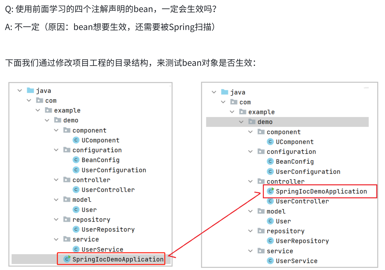 @SpringBootApplicationpublic class SpringIocDemoApplication {public static void main(String[] args) {//获取Spring上下⽂对象 ApplicationContext context = SpringApplication.run(SpringIocDemoApplication.class, args);//从Spring上下⽂中获取对象 UserComponent userComponent = context.getBean(UserComponent.class);//使⽤对象 userComponent.sayHi();}}