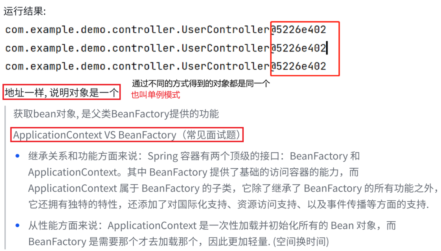 @SpringBootApplicationpublic class SpringIocDemoApplication {public static void main(String[] args) {//获取Spring上下⽂对象ApplicationContext context = SpringApplication.run(SpringIocDemoApplication.class, args);//根据bean类型, 从Spring上下⽂中获取对象;有局限性,一个类型对应多个bean。UserController userController1 = context.getBean(UserController.class);//根据bean名称, 从Spring上下⽂中获取对象;一个bean可以有多个名称,但是名称不会重复。UserController userController2 = (UserController)context.getBean("userController");//根据bean类型+名称, 从Spring上下⽂中获取对象UserController userController3 = context.getBean("userController",UserController.class);System.out.println(userController1);System.out.println(userController2);System.out.println(userController3);}}