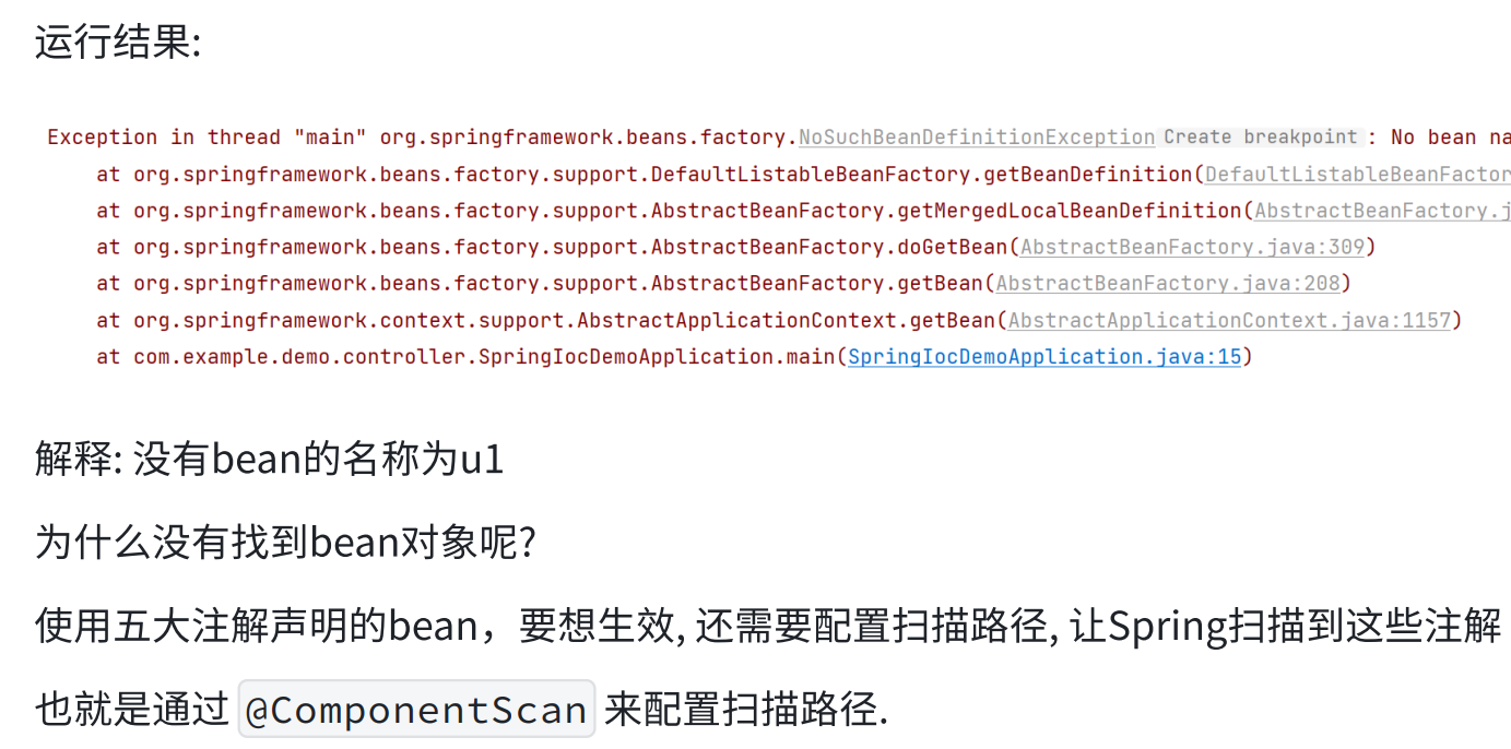 在Spring框架的设计中,方法注解 @Bean 要配合类注解才能将对象正常的存储到Spring容器中, 如下代码所示。