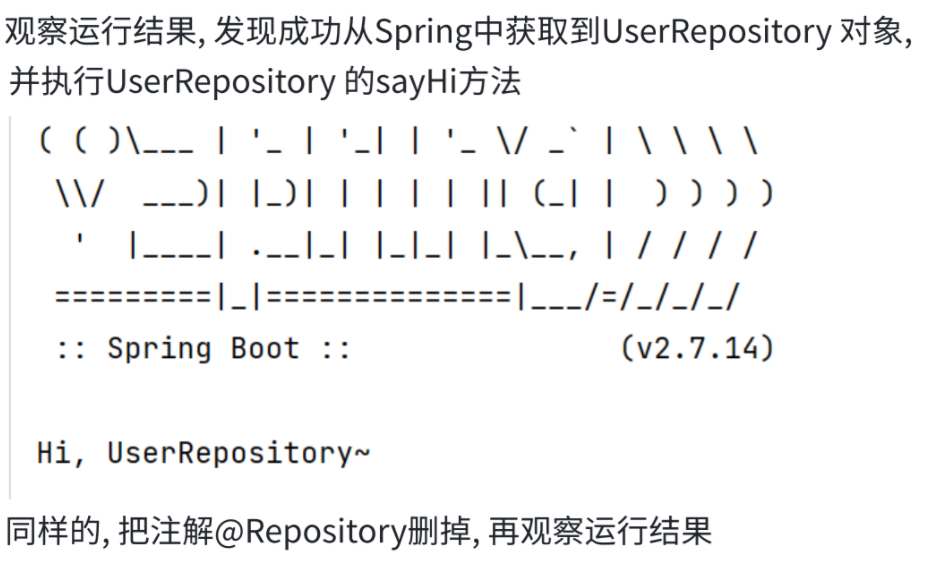@Repositorypublic class UserRepository {public void sayHi() {System.out.println("Hi, UserRepository~");}}