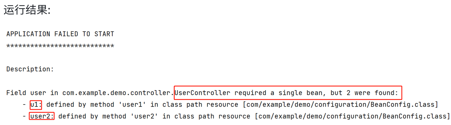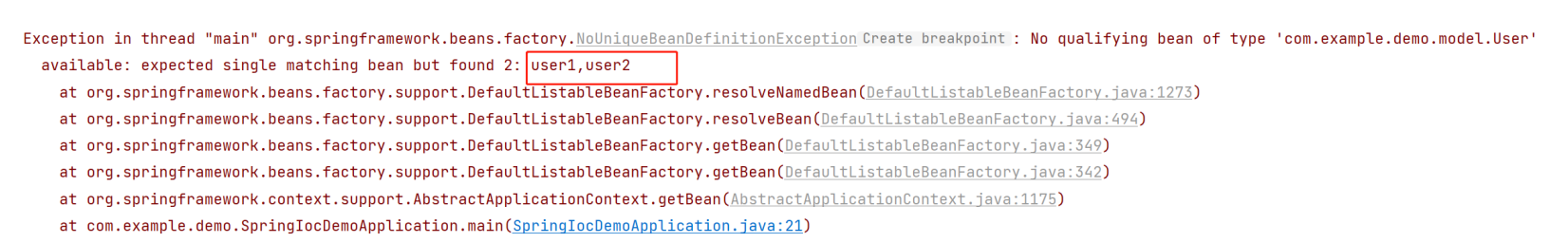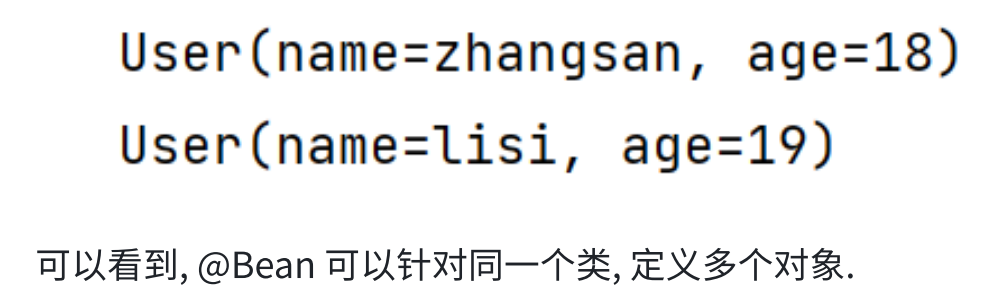 public class BeanConfig {@Beanpublic User user1(){User user = new User();user.setName("zhangsan");user.setAge(18);return user;}@Beanpublic User user2(){User user = new User();user.setName("lisi");user.setAge(19);return user;}