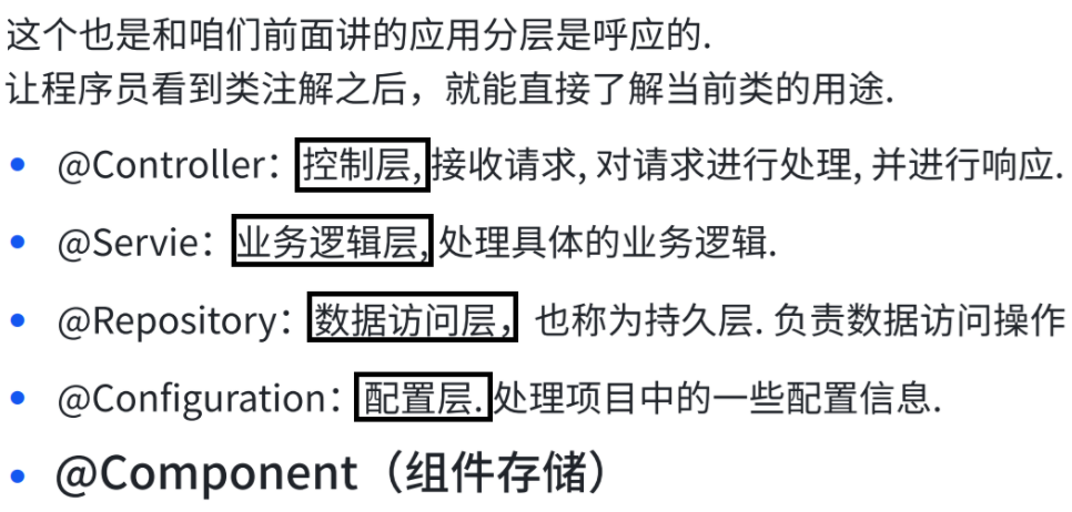在之前的入门案例中,要把某个对象交给IOC容器管理,需要在类上添加⼀个注解: @Component,而Spring框架为了更好的服务web应用程序,提供了更丰富的注解。【Spring帮我们new了对象 所以我们可以直接调用】