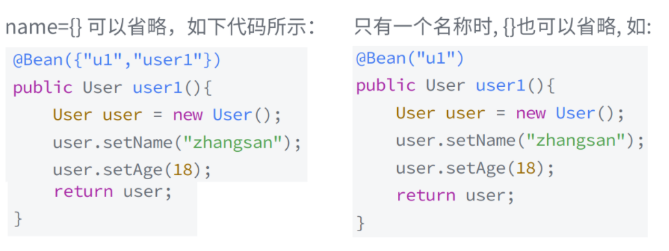 public class BeanConfig {@Bean("u1")public User user1(){User user = new User();user.setName("zhangsan");user.setAge(18);return user;}@Beanpublic User user2() {User user = new User();user.setName("lisi");user.setAge(19);return user;}