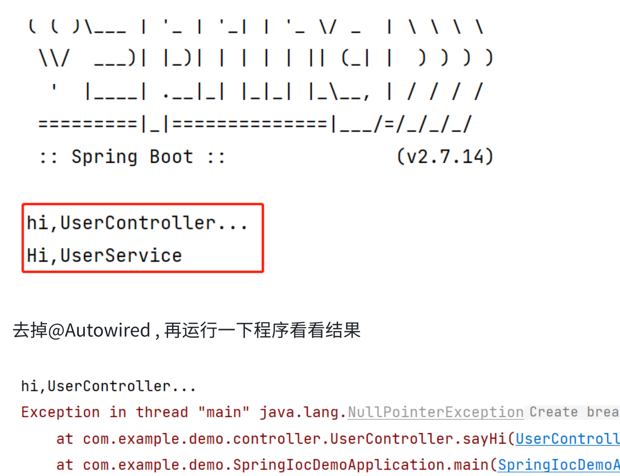 public class UserController {//注⼊⽅法1: 属性注⼊ @Autowiredprivate UserService userService;public void sayHi(){System.out.println("hi,UserController...");userService.sayHi();}
