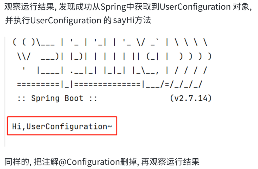 @Configurationpublic class UserConfiguration {public void sayHi() {System.out.println("Hi,UserConfiguration~");}}
